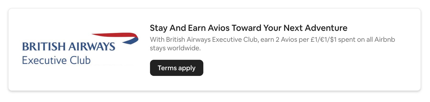 This portal grants 2 points per dollar spent. With the ease of transferring Avios between Iberia, Finnair, and Qatar, British Airways Avios are a great currency to passively gain from your Airbnb transaction.